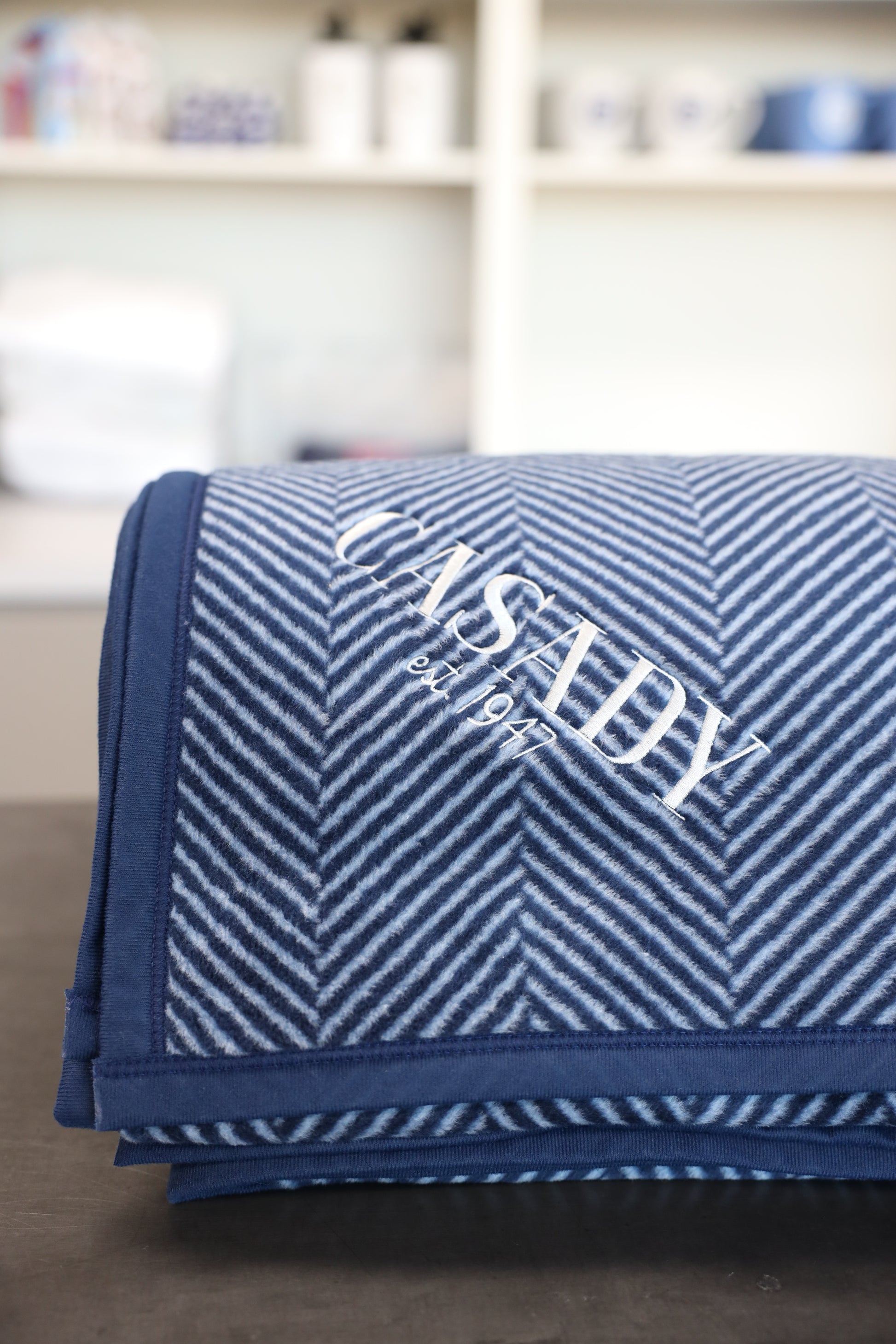This time-tested print is always easy on the eyes. In classic two-toned blue, our take on herringbone takes things to new softness and style heights. Featuring a sleek and high quality Casady embroidery.