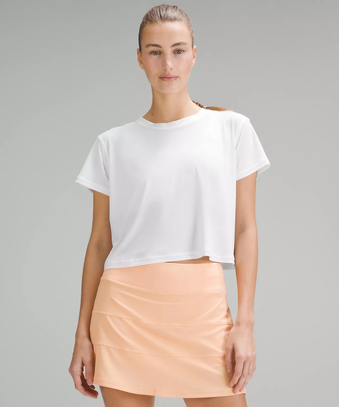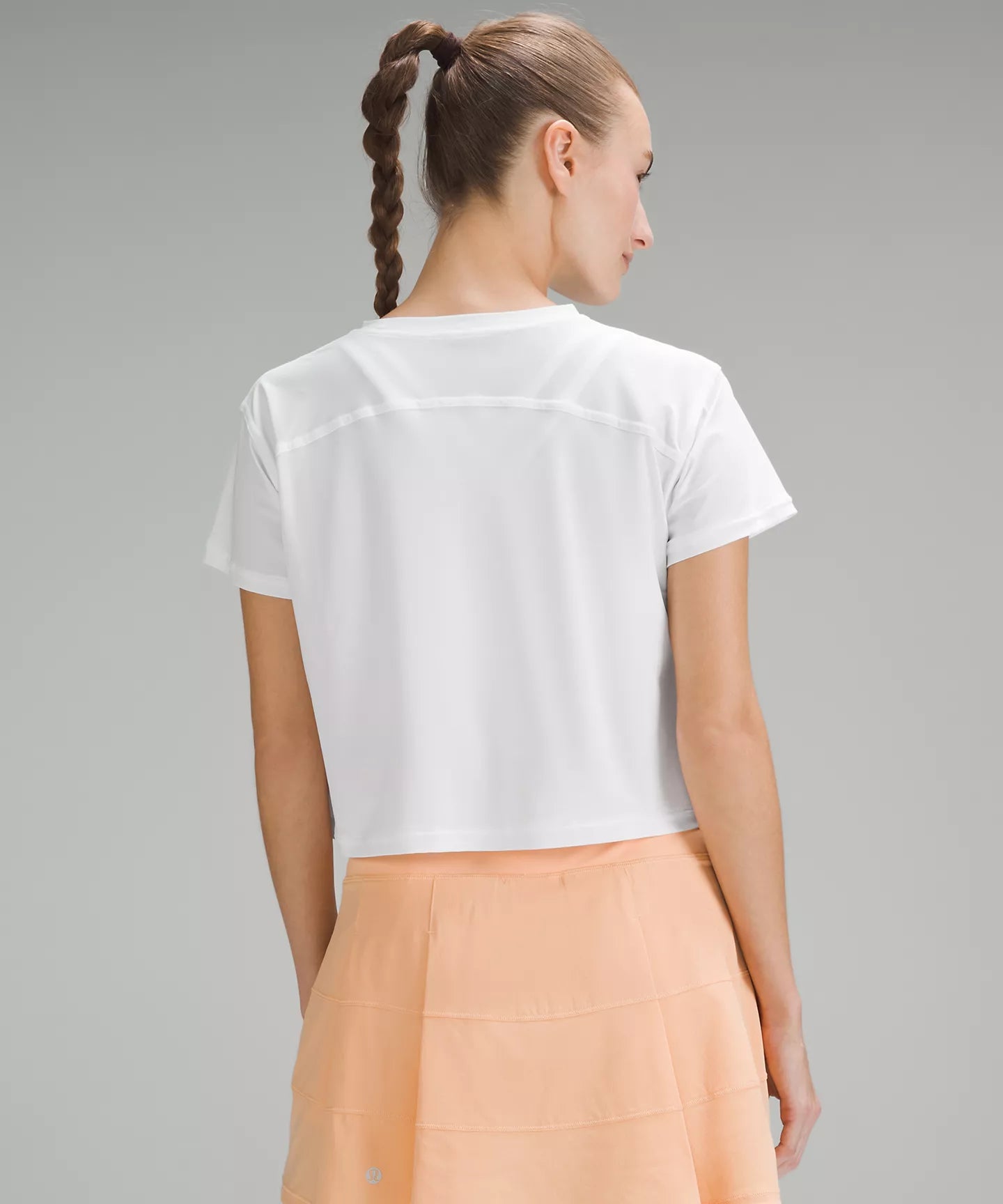 This relaxed t-shirt provides smooth, comfortable coverage no matter what activity you're doing. Loose fit with a little extra room. Length hits right around the waistband. Features a navy crest at the back neck area.