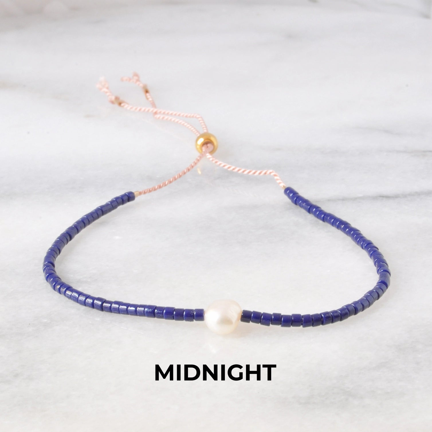 These fun delicate beaded bracelets are fully adjustable making them the perfect gift. (And yes, self-gifting is highly recommended!) Cultured freshwater pearl and glass seed beads on durable blush silk cord.