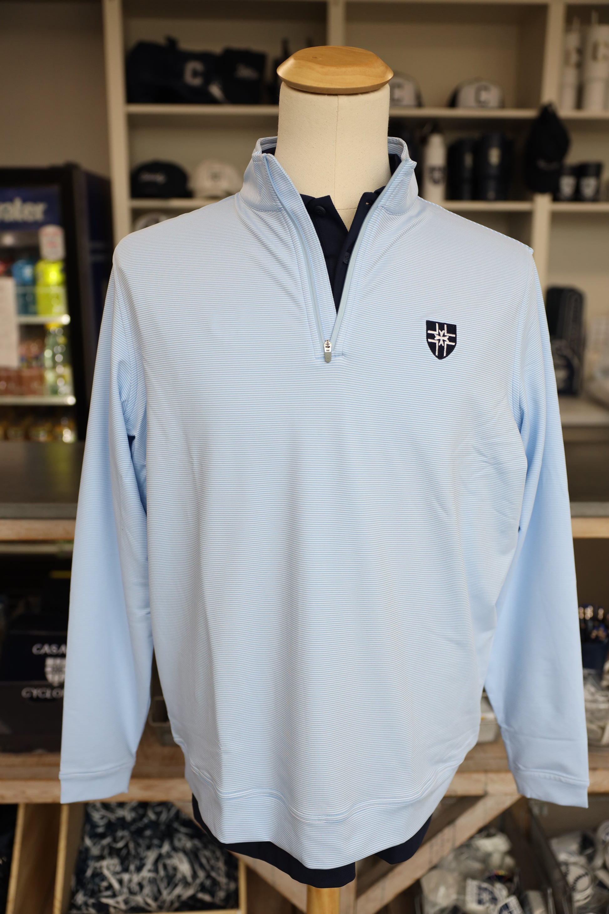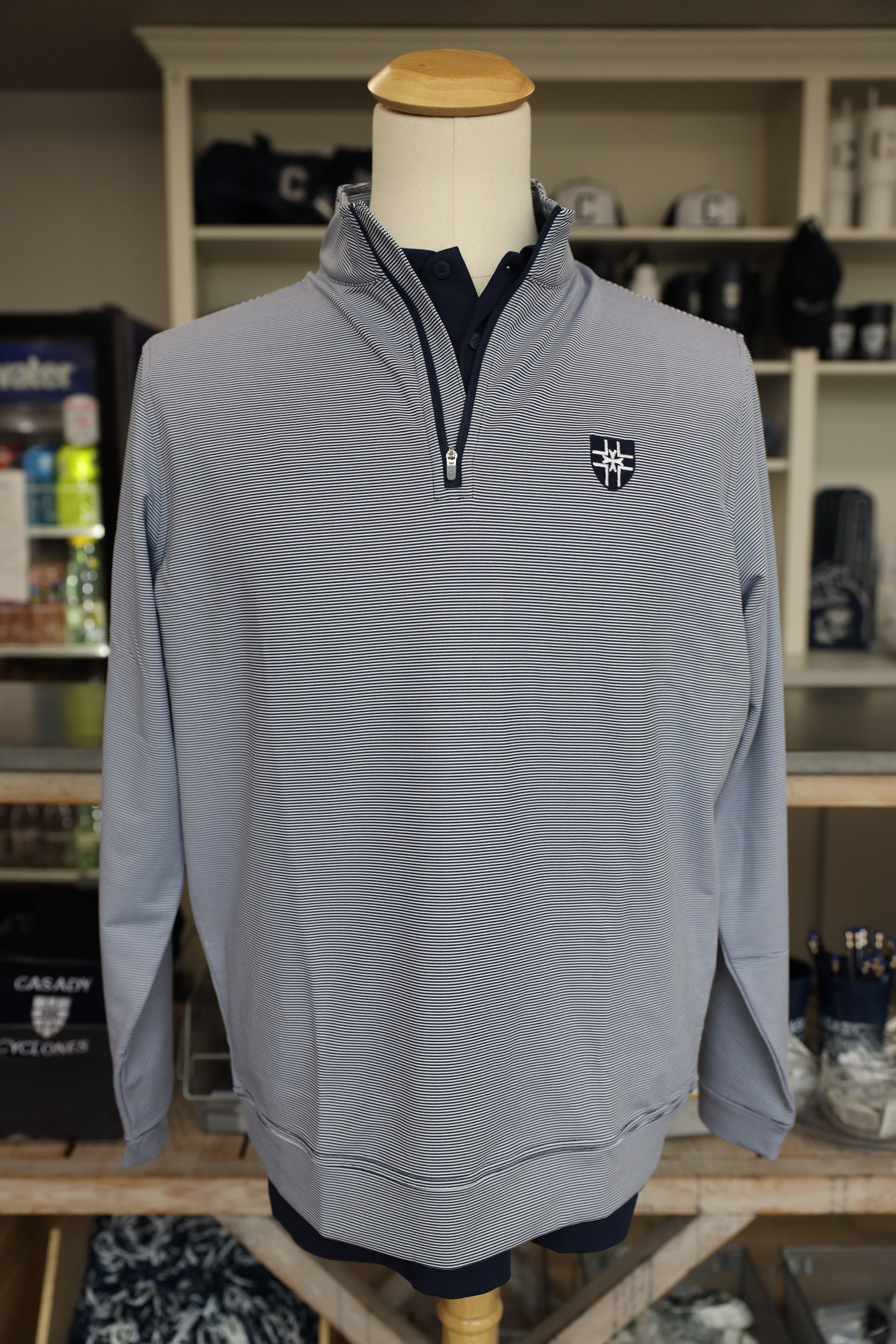 Embroidery details: Navy - C embroidery, Cottage Blue Stripe - Casady Crest, Navy Stripe - Casady Crest, Stone - Casady Crest